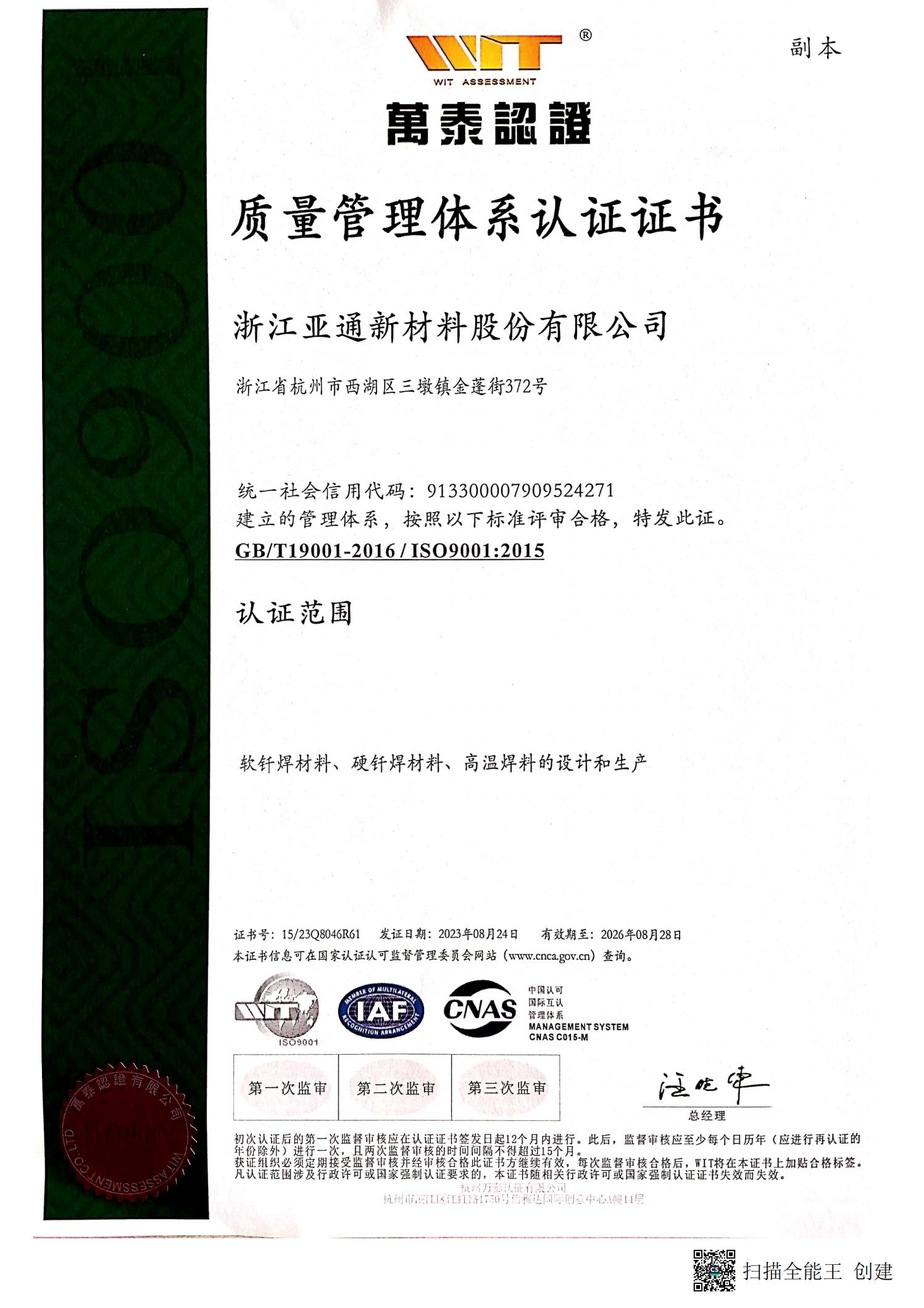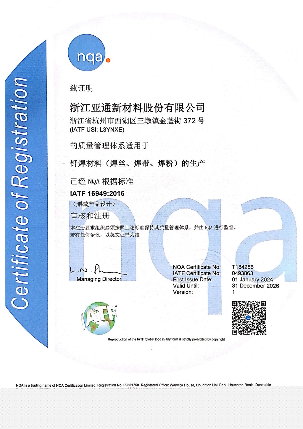 浙江亞通新材料股份有限公司是世界500強企業(yè)杭鋼集團投資設立的高新技術企業(yè),位于杭州市西湖區(qū)紫金港科技城,專業(yè)從事高中低溫全系列釬焊材料和金屬粉體的研發(fā)生產(chǎn)和銷售,是國內(nèi)焊接材料行業(yè)的核心企業(yè)之一,多項國家標準的主要起草單位。公司在中國電子材料行業(yè)協(xié)會、國家標準化技術委員會、中國焊接協(xié)會等專業(yè)機構擔任領導職務,在行業(yè)內(nèi)具有廣泛影響力。