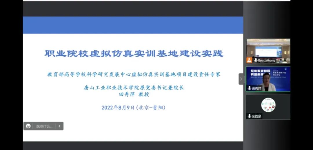 國家職業教育虛擬仿真示范實訓基地責任專家,唐山工業職業技術學院原黨委書記、校長,二級教授田秀萍作《職業院校虛擬仿真基地建設實踐》主題報告。田秀萍對職業院校虛擬仿真基地的建設背景、建設意義、建設路徑三個方面進行了闡述,并對職業教育虛擬仿真基地建設典型案例進行了解讀。