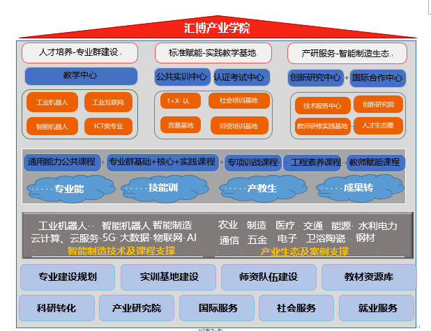 匯博機器人一直致力于智能制造、人工智能及新一代信息技術的核心技術研發及人才培養綜合解決方案上,融合多年領域實際產業經驗,積極投身于工業機器人、智能制造、人工智能及工業互聯網等新興專業建設及人才培養體系中, 協同校、政、企開展聯合辦學、專業共建、混合所有制等多種形式的產業學院建設新模式,為高校在專業或新工科建設、公共實訓基地建設、師資培養、科研成果轉化、國際化辦學、高端就業服務等領域提供一系列解決方案。